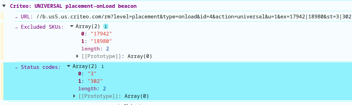 window.BeaconSDK.enableDebug();Once enabled, BeaconSDK will log each beacon it sends to the browser console. These logs start with the prefix Criteo: sent [beacon-level]-[beacon-type] beacon:.