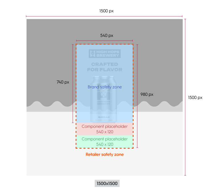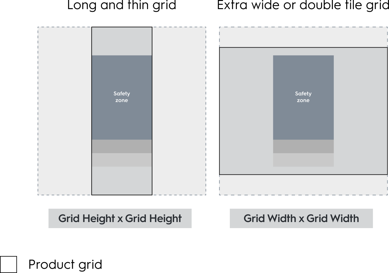 - Large grid When the grid width is greater than 270 pixels and the height is greater than 500 pixels, the background image is displayed at 50% of its original size (750×750). The Retailer Safety zone is 270 px by 495 px.