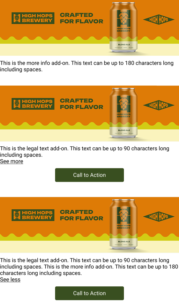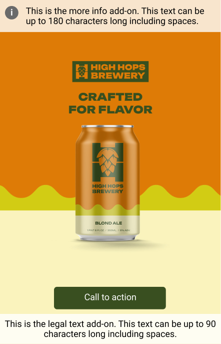 "More Info" with CTA and legal text example for the Branding Display Grid Solo format (mobile)