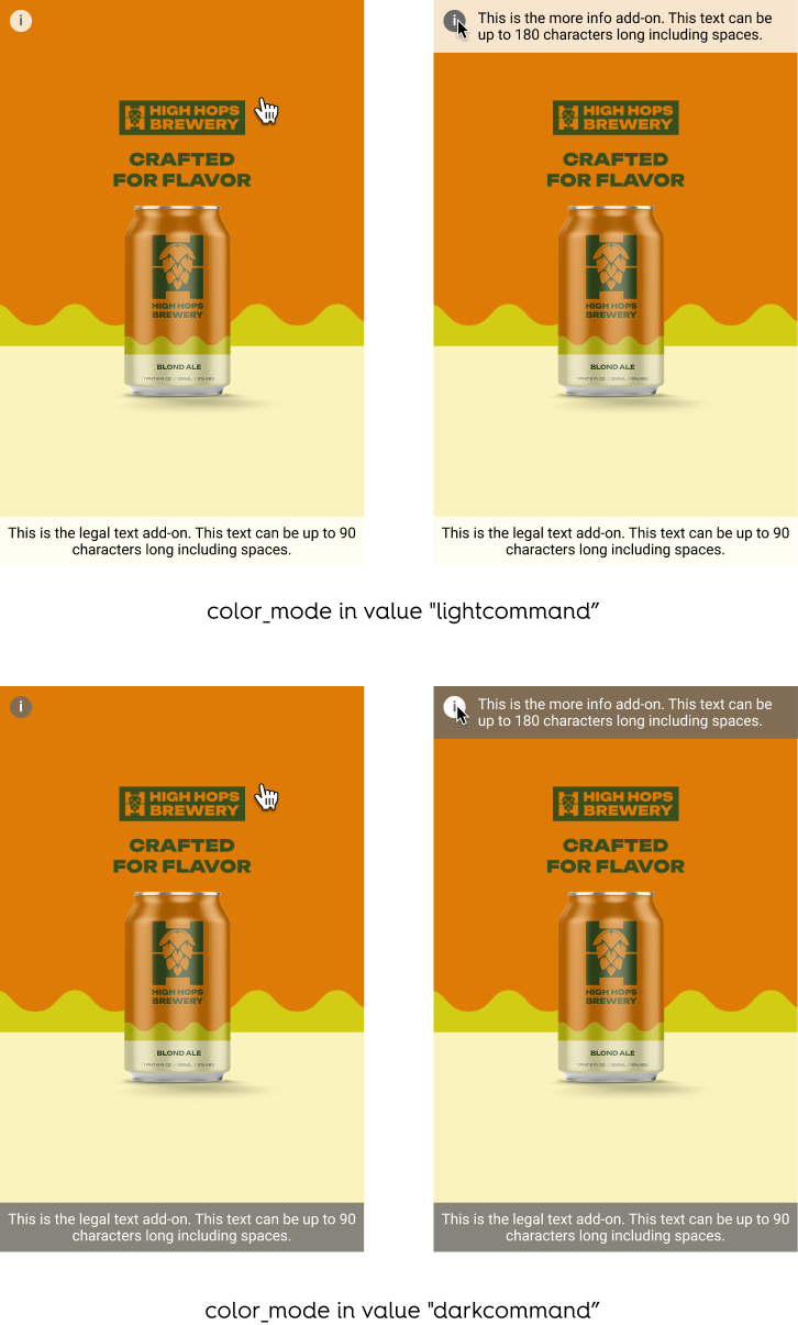 The advertiser can choose between two preset color modes to ensure the best contrast between text options and the branding zone. Options appear while hovering over the Branding Zone.