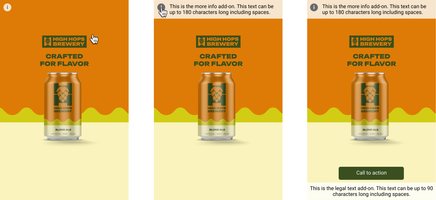 "More Info" with CTA and legal text example for the Branding Display Grid Solo format
