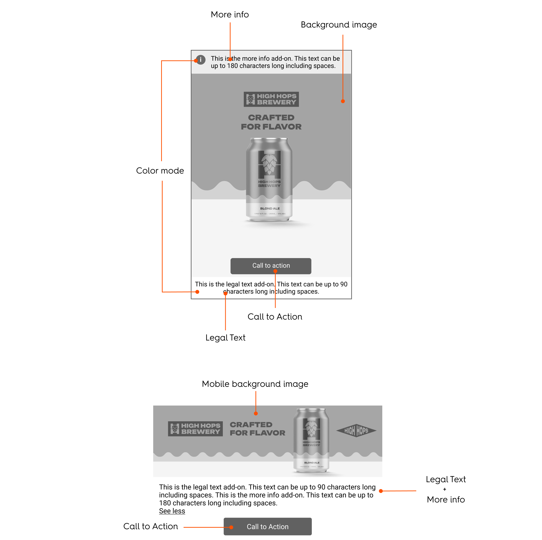 Two equal internal placeholders are used for legal text and a call-to-action (CTA) button. These are treated as margins and ensure no overlap with the Brand safety zone.