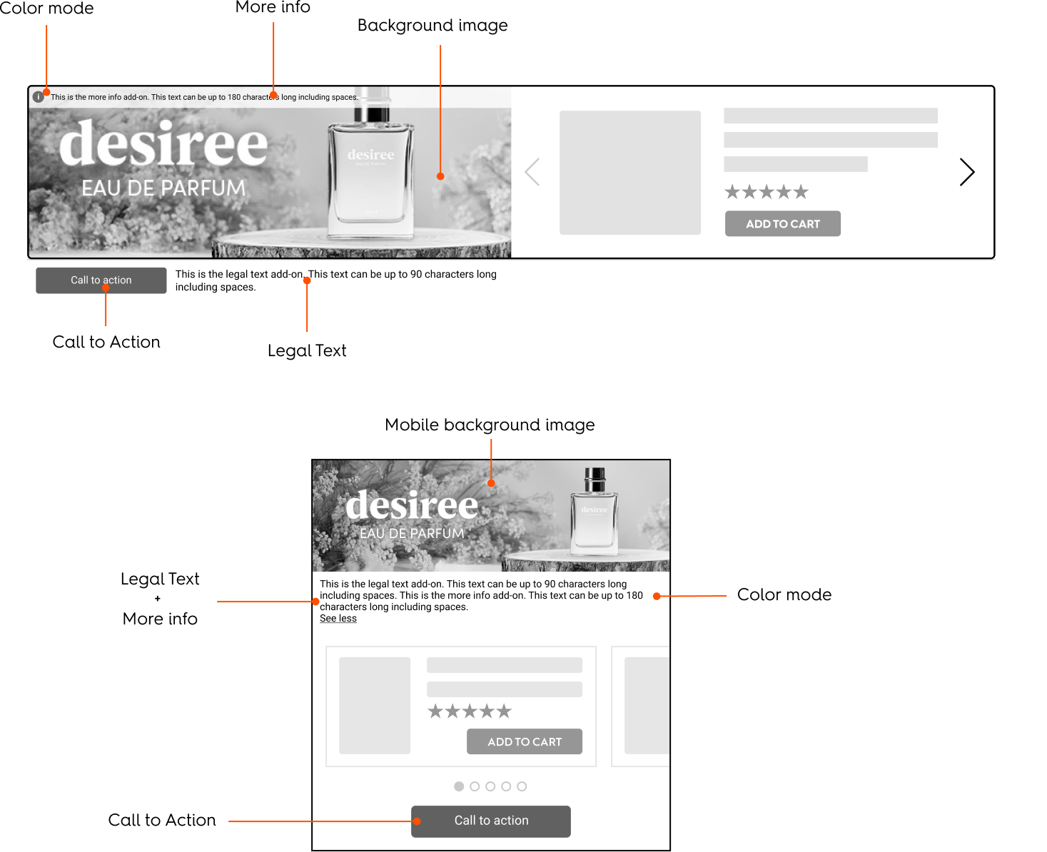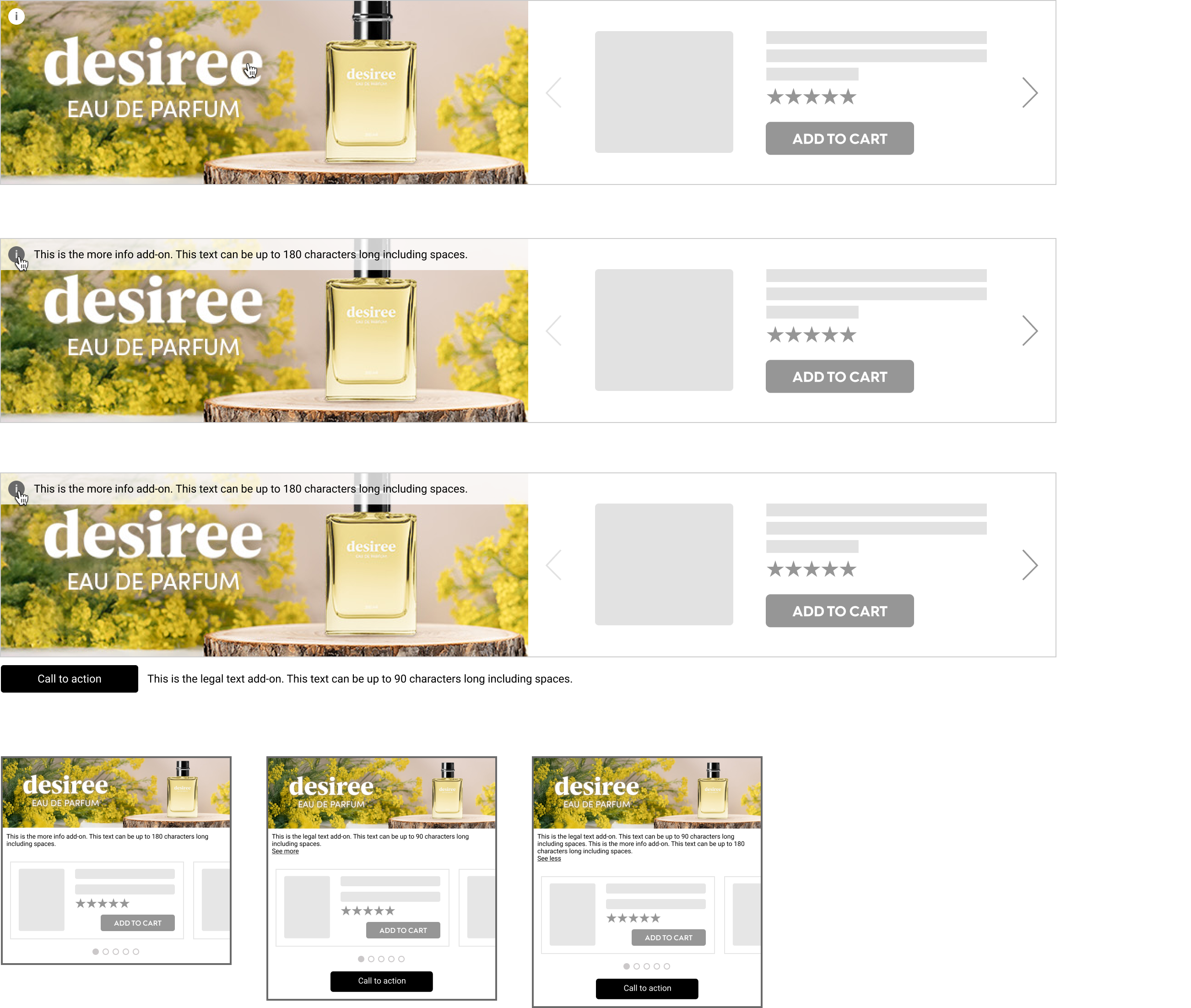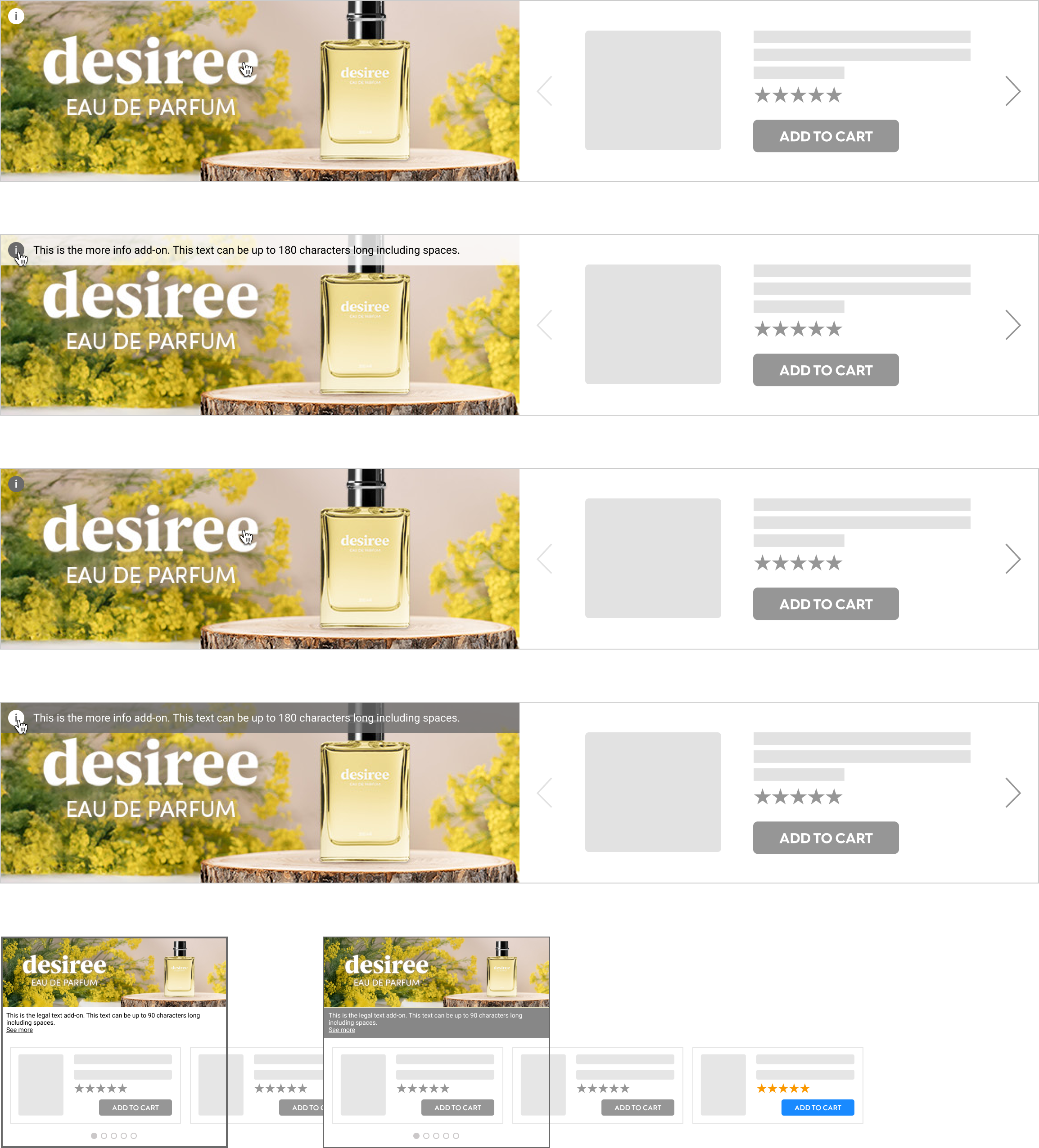 Example of "More Info", CTA and legal text for the Commerce Display Spotlight (desktop & mobile)