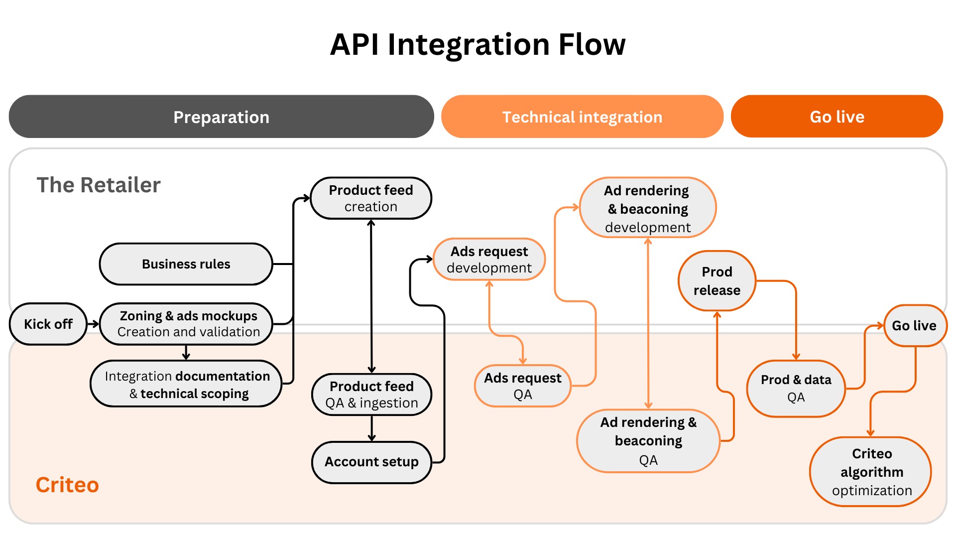 - The preparation phase follows the initial kick-off. That's a time dedicated to the creation and validation of the ad formats and mock-ups, as well as providing the integration documentation and setting up the product feed alongside its QA and ingestion. This is followed by the account setup.